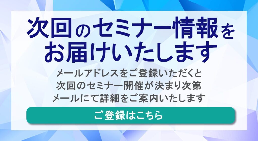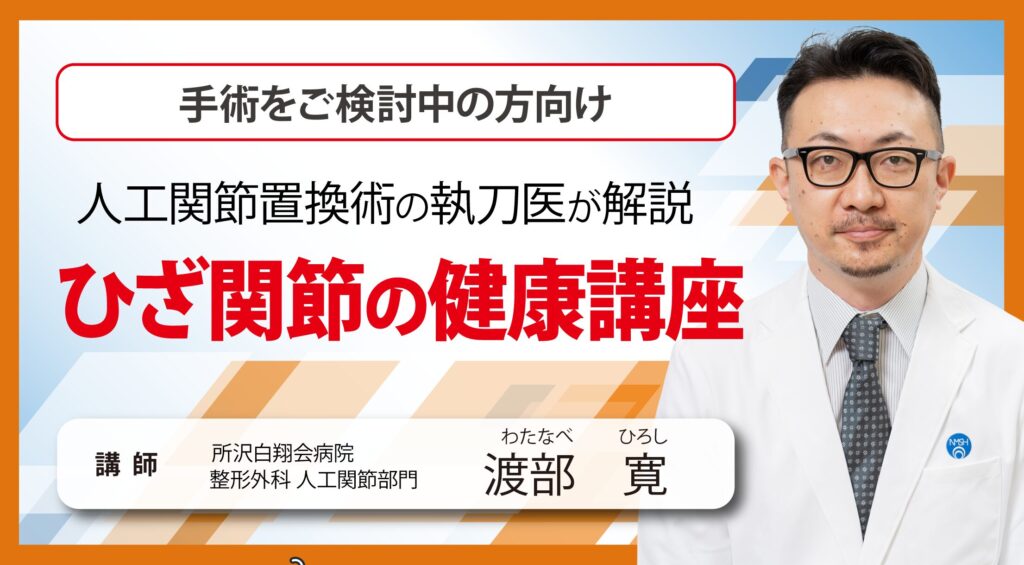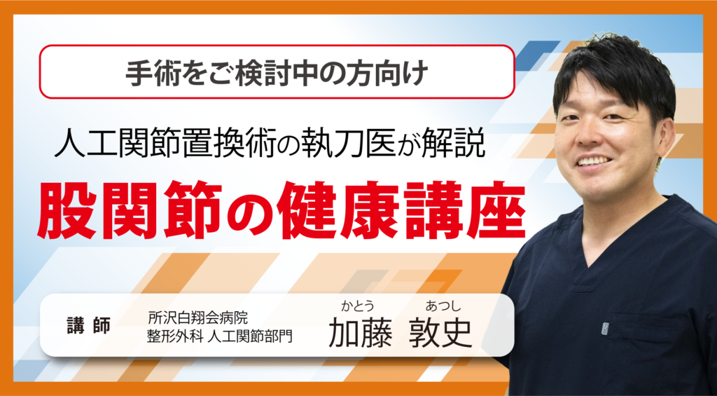 2026年3月28日(土) 股関節の健康講座 開催場所:東上パールビルヂング 詳しくはこちら 2026年4月18日(土) 膝関節の健康講座 開催場所:狭山市市民会館 詳しくはこちら 2026年4月25日(土) 股関節の健康講座 開催場所:所沢市民文化センターミューズ 詳しくはこちら 次回セミナー開催案内 開催場所:決定次第、当ページにてお知らせ 詳しくはこちら